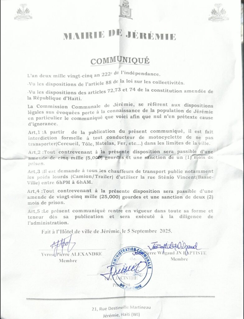 Daprè kominike a, depi piblikasyon dokiman sa a, tout chofè moto entèdi pote chay tankou sèkèy, fè, tòl, matla, ak lòt gwo chay nan vil Jeremi. Tout moun ki pa respekte desizyon sa a ap oblije peye 5 000 goud epi ka pase 1 mwa nan prizon.