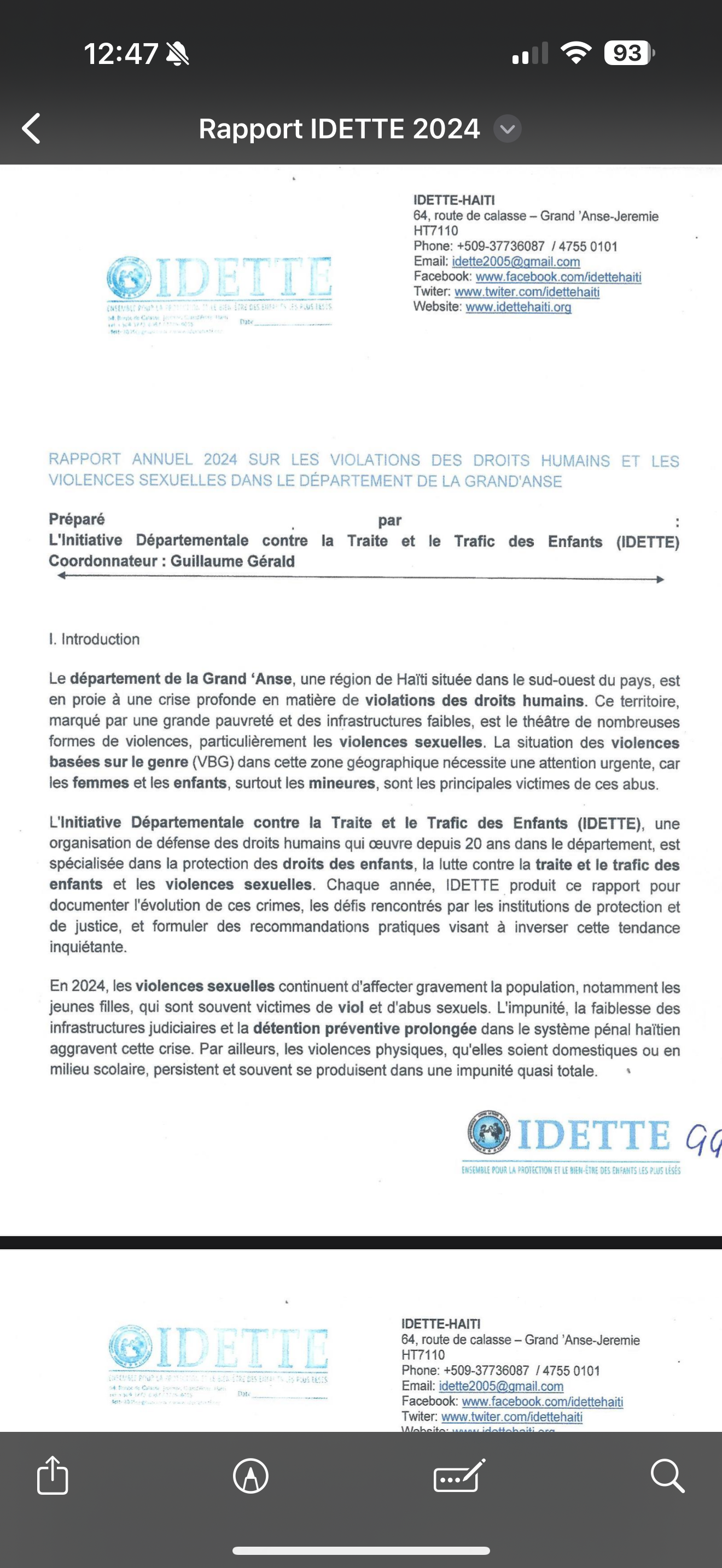 L’Initiative Départementale contre la Traite et le Trafic des Enfants (IDETTE) alerte sur la recrudescence des violations des droits humains et violences sexuelles dans le Département de la Grand’Anse. Dans son rapport annuel de 2024, l’organisation dénonce une situation marquée par l’insécurité, par l’impunité et par la vulnérabilité des femmes et des enfants, notamment des mineures en sept (7) grands points.